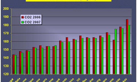 La moyenne pondérée du nombre de voitures vendues (le barycentre) ressort à 158g/km, la faire descendre à 130 g en 2012 va demander des efforts, même pour le Portugal (143 g/km), l’Italie (146 g/km) et le France (148 g/km) qui sont pourtant les bons élèves de l’Europe sur ce critère.