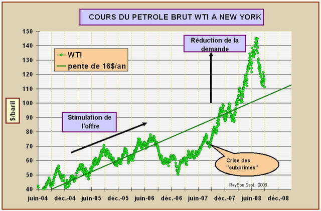 La réduction de la consommation de pétrole américaine, en cumulé depuis le début 2008, de près de 1,1 millions de barils par jour à fin Juin, et qui semble se poursuivre, entraîne une stagnation de la consommation mondiale de pétrole. En contrepartie les productions OPEP ont atteint 38 millions de barils de liquides (pétrole+ gaz liquéfiés) à fin Juillet en croissance de plus de 2 millions de barils (+6%) par rapport à Juillet 2007. Ces deux paramètres fondamentaux, dont les variations sont liées au formidable accroissement des prix du baril, conséquence de la crise des hypothèques de l’été 2007, militent pour un repli des cours autour de leur tendance longue quantifiée par la droite de corrélation établie sur plus de 4 ans de hausse des cours (FIG.). Ces deux paramètres importants sont amplifiés par la tendance à la valorisation des cours du dollar qui fait partir les investisseurs à la recherche d’une couverture (« edging ») dans le papier (« future ») adossé aux cours du pétrole. Le cours d’équilibre sur la tendance longue est aujourd’hui autour de 105$/baril.