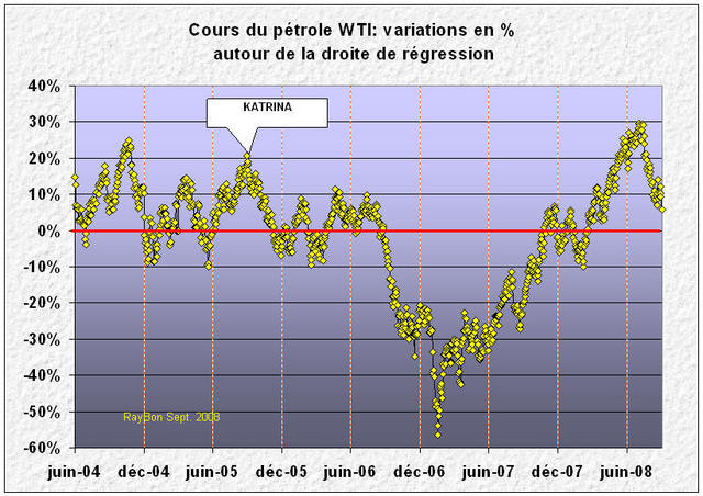 Les cours du pétrole WTI pourraient donc rester sagement autour de ce point d’équilibre entre 100 et 110$/baril. Mais c’est oublier la financiarisation des cours de ce produit. Les Marchés financiers devant les nouvelles de stabilisation des consommations, vont à coup sûr essayer de tester les cours du pétrole à la baisse, amplifiant la tendance à la baisse comme ils l’ont fait à la hausse, c’est leur « job ». On mesure ce phénomène d’amplification au cours du temps par la différence entre le cours du jour et sa valeur sur la droite de corrélation (FIG.). La fièvre des cours due à Katrina qui avait semblé gigantesque à l’époque, n’apparaît plus que comme un petit sursaut sur cette courbe. Il est évident, à l’examen de cette courbe différentielle, que les cours du pétrole WTI peuvent gaillardement descendre de 15 à 20 dollars au dessous de la tendance longue.