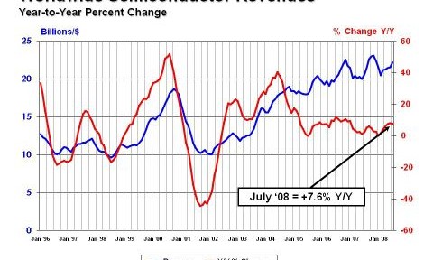 Certains commentaires économiques parlant de l’Espagne, de la Grande-Bretagne, de la France ou des Etats-Unis (avant révision des chiffres trimestriels) pourraient faire croire que pour des questions financières généralisées, le monde entier est en crise. La bonne marche de l’industrie des semi-conducteurs est là pour contredire une telle impression hâtive. Le marché mondial ces composants, d’après la Semiconductor Industry Association (SIA), est en hausse de 7,6% au mois de Juillet, par rapport à il y a un an, à 22,2 milliards de dollars (FIG.). En cumulé depuis le début de l’année cette croissance est de 5%. Ce n’est donc pas l’euphorie, par rapport à des périodes qui ont été bien plus fastes, mais la tendance est bonne. Ce qui est très intéressant ce sont les commentaires de la SIA sur les marchés utilisateurs de ces semi-conducteurs.Semiconducteurssia