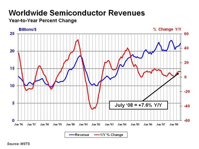 • seules les mémoires avec l’effondrement des prix, tirent le marché vers le bas, mais les volumes de ces produits croissent. Hors mémoires la croissance du mois de Juillet est de 11,6%, elles font donc perdre trois points de croissance au marché mondial des chips.