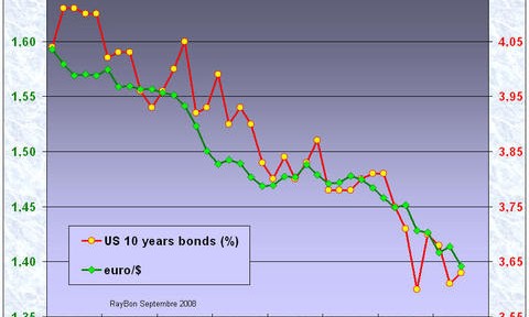 Les taux à dix ans des US Bonds, qui sont suivis par le taux de l’emprunt allemand à 10 ans avec un léger décalage vers le haut de 0,3 à 0,4% ont perdu 45 points de base durant cette période, démontrant ainsi des anticipations de baisse de l’inflation. Le reflux des liquidités qui ont quitté la spéculation sur les matières premières et les affres de la Bourse, malmenée par les « write-off » répétitifs de milliards de dollars des Banques d’Affaires, expliquent également cette baisse. (Notez bien que dans le cas des emprunts, plus la demande est forte, plus les taux baissent).