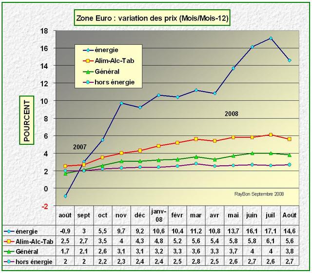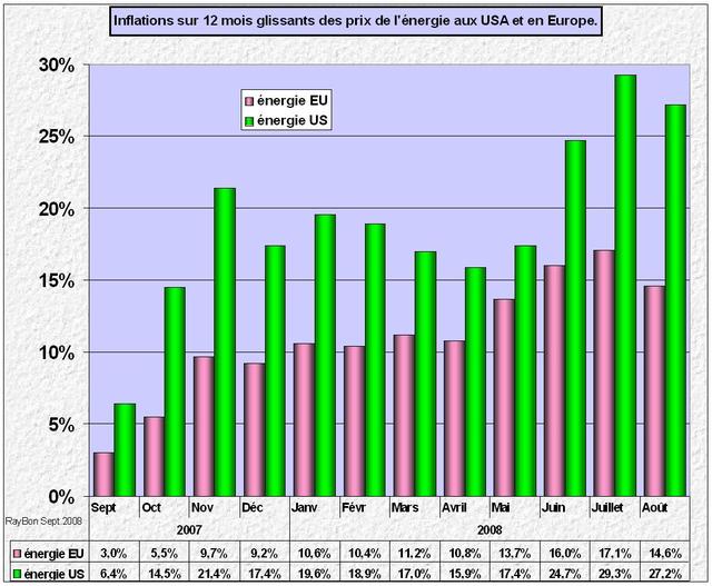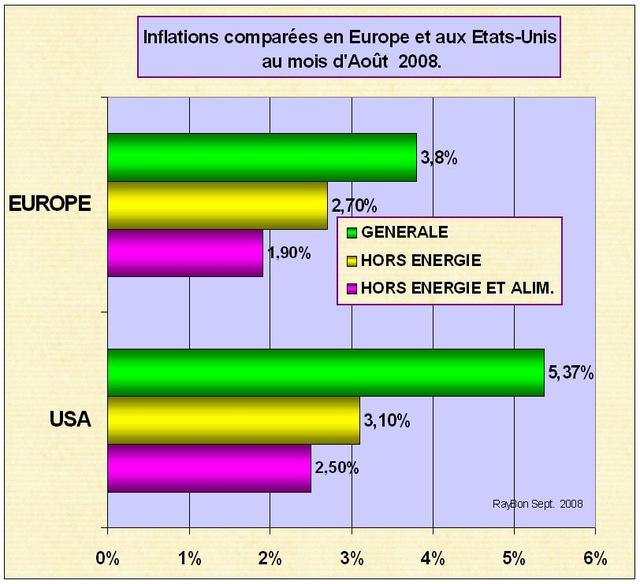 La moindre croissance sur douze mois, des prix de l’énergie de 2,5 points en Zone Euro et de 2 points aux USA (FIG.) permet de calmer un peu les taux d’inflations dans les deux zones économiques.Inflationenergieusue200808_2