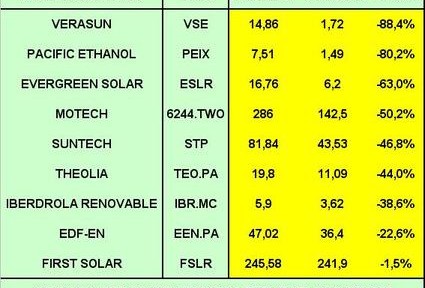 si la baisse est si impressionnante tandis que le secteur des énergies renouvelables n’est pas en crise, bien au contraire, (et contrairement aux autres secteurs précités), c’est aussi parce que dans les 5 dernières années, ces valeurs ont fait des hausses allant jusqu’à plusieurs centaines de % !!!