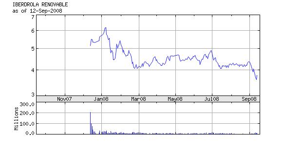 Dans les énergies solaires les résultats boursiers sont loin de traduire le dynamisme du secteur. Le premier chinois, Suntech et le premier taiwanais, Motech ont perdu la moitié de leur valeur, tirés vers le bas par la baisse des bourses asiatiques. Seul l’américain First Solar avec sa technologie économique au Cd-Te qui devrait résister aux baisses de prix, apparaît comme une exception avec un cours quasiment inchangé. En Europe, Théolia à la trésorerie mal en point, perd 44%. L’espagnol Iberdrola Renovable (FIG.) qui devait être un modèle de réussite a perdu 38% et EDF Energies Nouvelles qui doit se recapitaliser par un appel de fonds, n’a perdu que 22%, un miracle. Le modèle économique de ces trois dernières Sociétés a du mal à tenir le coup, laminé par les prix exubérants des investissements, payables d’avance et la montée des taux du crédit. Iberdrolarenovable200809_2