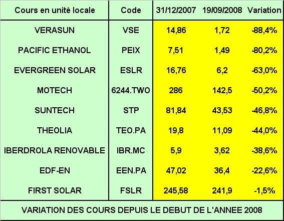 Il n’y aura pas de bulle spéculative sur les cours des actions de Sociétés spécialisées dans les  énergies renouvelables, la nouveauté fait maintenant peur. Les aventures lointaines n’ont plus la cote auprès des investisseurs, la peur l’a emporté sur le lucre. L’éthanol américain, mis en corner par les cours du maïs, entravé par les problèmes de logistique d’un produit non transportable dans les pipe-lines locaux, se révèle être un vrai fiasco pour les moins performants. Pacific Ethanol a presque atteint le statut de « penny stock » et VeraSun a dû retirer à toute vitesse une augmentation de capital de 20 millions d’actions, devant la débandade de son cours. Il devrait être en perte au troisième trimestre.Renouvelablescours200809