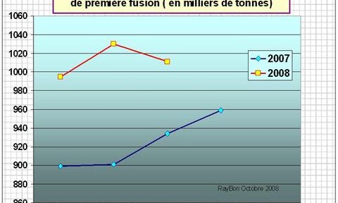Alcoa est traditionnellement la première grande Société américaine industrielle à publier ses résultats trimestriels. Ceux du troisième trimestre marquent le ralentissement de certains secteurs de l’économie. Si les ventes d’alumine, à d’autres producteurs d’Aluminium, se sont bien tenues à plus de 2 millions de tonnes à un très bon prix de 400$ la tonne, les ventes d’Aluminium se sont repliées vers un million de tonnes (FIG.) à des prix moyens à 2945 $ la tonne, en recul de plus de 100$. La faute aux grèves chez Boeing pour les produits laminés, aux baisses de productions de voitures et de poids lourds aux Etats-Unis et à de moindres ventes de pièces de détachées pour l’aéronautique, pour ce qui est des produits usinés. Le commerce de l’aluminium est un bon indicateur de la marche des industries du transport qui ne vont pas très fort en ce moment.