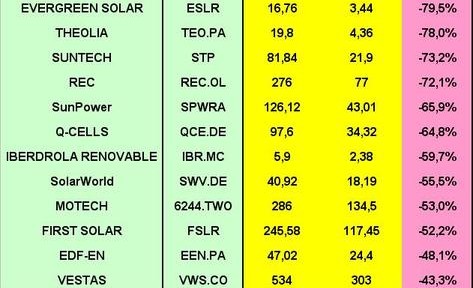A tout seigneur, tout honneur, notre française THEOLIA s’est imposée cette semaine encore, en perdant 39% de sa valeur et se rapprochant des 4 euros. Besoin de capitaux, un modèle qui ne marche pas quand l’argent est cher, quand les fournisseurs se font payer d’avance, pour livraison dans deux ans. Une seule solution, arrêter d’investir, replier la voilure, rembourser en partie les dettes et trouver un acquéreur.