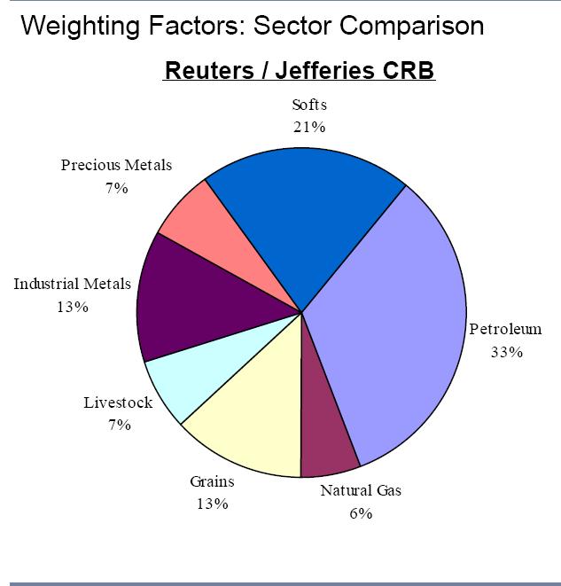 Le Reuters Jefferies CRB Index est un des indices les plus suivis aux Etats-Unis pour anticiper au sein des tensions inflationnistes, la part des matières premières et de l’énergie (commodities). Son suivi permet en particulier sur de courtes périodes de quantifier l’aspect spéculatif global des variations de prix de ces commodities. Cet indice est constitué de pétrole WTI, de gaz naturel, de grains, de cheptels, de métaux industriels ou précieux et de produits softs (maïs, soja, sucre, coton, café, cacao)…un vrai inventaire à la Prévert (FIG.).