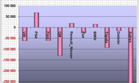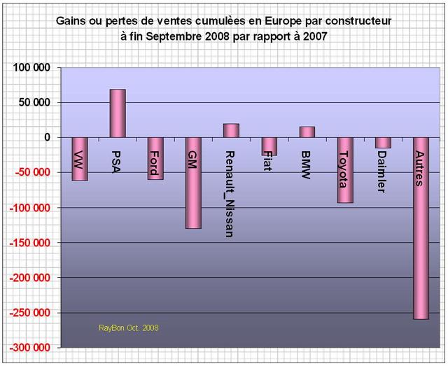 Les ventes européennes (EU + Suisse + Norvège + Islande) de voitures particulières ont fléchi de 8,2% au mois de Septembre par rapport à celles du même mois 2007. Avec 1,305 millions d’exemplaires, les ventes ont reculé de 117 mille exemplaires. En cumulé depuis le début de l’année le recul est de 4,2%, à 12,25 millions de véhicules, soit un recul de 541 mille exemplaires par rapport à 2007. Cette décroissance par constructeurs se décompose en deux groupes. L’un en croissance constitué de VW, Renault-Nissan et BMW, l’autre en décroissance avec une forte contribution négative des petits constructeurs, de GM, de Toyota, de VW et de Ford. A ce rythme et compte tenu des restrictions de crédit en cours, c’est une mévente proche d’un million d’exemplaires en Europe qui est à projeter pour la totalité de l’année 2008.