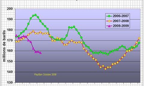 A la fin de la semaine dernière, les stocks hebdomadaires américains de pétrole brut se sont accrûs de 5,6 millions de barils et ceux d’essence se sont élevés de 7 millions de barils en raison de consommations faibles et d’importations trop fortes (13,7 millions de barils par jour de brut et de produits raffinés). Ces deux indicateurs suffiront à faire baisser à court terme les cours du brut WTI. Mais il faut également noter une baisse des stocks de gasoil+ kérosène d’un million de barils qui atteint 158 millions de barils. A la même époque l’an dernier ces stocks étaient à 20 millions de barils au dessus et ils se situaient même à trente millions de barils au dessus, il y a deux ans (FIG.). Dans l’hypothèse d’un hiver froid et précoce, le marché des produits pétroliers américains pourrait rapidement se tendre, les regards se reportant alors sur les stocks de fuel.