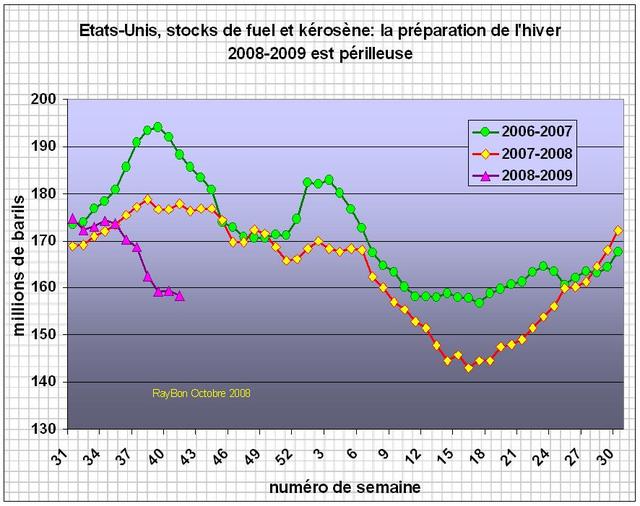 A la fin de la semaine dernière, les stocks hebdomadaires américains de pétrole brut se sont accrûs de 5,6 millions de barils et ceux d’essence se sont élevés de 7 millions de barils en raison de consommations faibles et d’importations trop fortes (13,7 millions de barils par jour de brut et de produits raffinés). Ces deux indicateurs suffiront à faire baisser à court terme les cours du brut WTI. Mais il faut également noter une baisse des stocks de gasoil+ kérosène d’un million de barils qui atteint 158 millions de barils. A la même époque l’an dernier ces stocks étaient à 20 millions de barils au dessus et ils se situaient même à trente millions de barils au dessus, il y a deux ans (FIG.). Dans l’hypothèse d’un hiver froid et précoce, le marché des produits pétroliers américains pourrait rapidement se tendre, les regards se reportant alors sur les stocks de fuel.