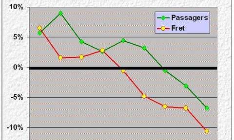 L‘IATA nous apprend un recul du transport aérien mondial au mois de Septembre de -2,9% pour le trafic passager, par rapport à celui du même mois de 2007, et de –7,7% pour le fret en avions cargos. Une analyse par Grandes Zones économiques indique que c’est surtout le recul des transports aériens en Asie qui impactent à la baisse la tendance mondiale. En effet l’Asie qui représente plus de 31% du trafic passager et 45% du trafic de fret dans le monde, affiche des résultats du mois de Septembre qui ne sont pas bons. Un examen depuis le début de l’année montre (FIG.) que cette dégradation du trafic aérien asiatique remonte à plusieurs mois. Dès le mois de Mai (courbe rouge) le trafic de fret était en repli et le trafic passager plongeait dès le mois de Juillet (courbe verte). Le tassement économique de la Zone Asie qui semble être nouveau, selon certains des commentateurs, est en fait inscrit depuis plusieurs mois dans les statistiques du transport aérien. Ce qui est nouveau c’est son aggravation.