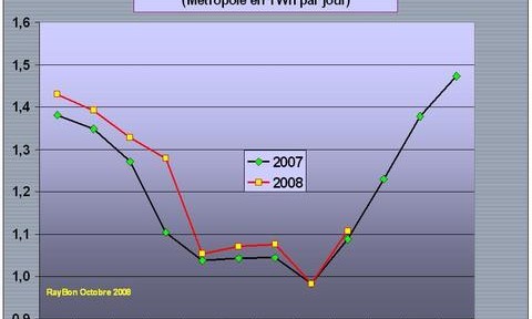 La consommation en électricité de la France métropolitaine nous dit RTE s’est accrûe de 4,5% en cumulé depuis le début de l’année à fin Septembre par rapport à la même époque en 2007. Cette croissance n’est que de 4,1% après correction de l’année bissextile. L’augmentation de consommation provient d’appels plus importants du réseau cet hiver, de Janvier à Avril (FIG.), mais aussi de besoins industriels accrûs entre les mois d’Avril et de Juillet.