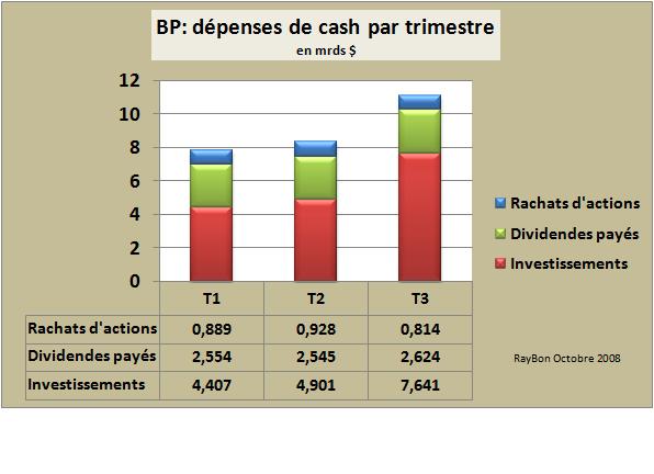 Par contre BP a ralenti son programme de rachats d’actions qui ne représente plus en 2008 que 8% du cash généré par les opérations contre 28% en 2007. Mais BP s’est désendetté sur des lignes de crédit court terme de plus de 3 milliards de dollars depuis le début de l’année.