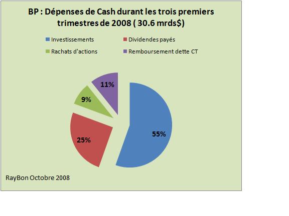 Depuis le début de l’année, les investissements croissants (FIG.) atteignent 17 mrds$ contre 9,5 mrds $ en 2007 à la même époque. C’est 52% du cash généré qui a été utilisé dans des équipements ou des acquisitions comme Husky dans l’Alberta qui permet à BP de faire son entrée dans les sables bitumineux, ou bien l’achat de gisements de gaz dans les schistes bitumineux à Chesapeake aux Etats-Unis.