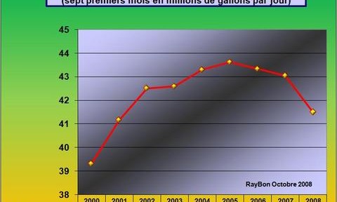 La Californie avec 37 millions d’habitants, est le modèle en pointe des Etats américains dans le domaine de la réduction du gaspillage de l’énergie sous toutes ses formes. Cet Etat, pour des raisons fiscales et non écologiques, publie chaque mois l’état des consommations en carburants. Le suivi de ces données illustre donc les tendances du moment. La baisse la plus importante, par rapport à la référence équivalente 2007, est celle de la consommation de gasoil qui apparaît à -7,9% au mois de Juillet et à -7,1% en cumulé depuis le début de l’année, exprimé en moyenne journalière pour corriger de l’année bissextile. Puis vient le poste le plus important en volume: la consommation d’essence. Elle est en baisse de 5,6% au mois de Juillet et de 3,6% en cumulé depuis le début de l’année (FIG.). Il est intéressant de noter qu’après un maximum atteint en 2005, cette décroissance avait timidement commencé depuis 2006, confirmée en 2007 et amplifiée en 2008.