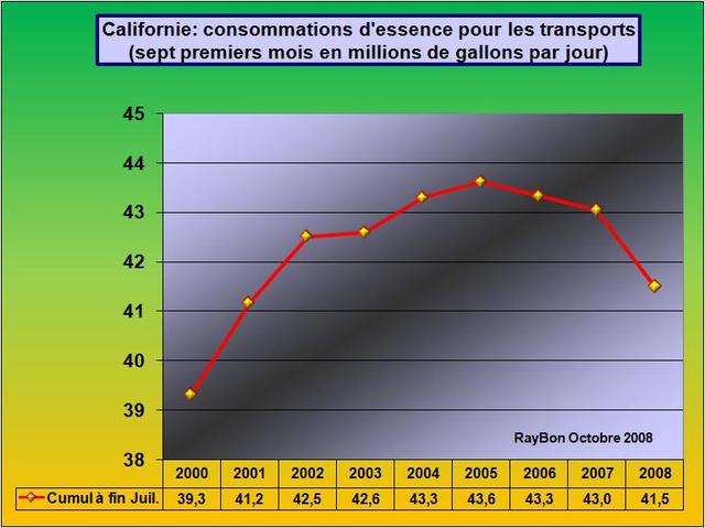 La Californie avec 37 millions d’habitants, est le modèle en pointe des Etats américains dans le domaine de la réduction du gaspillage de l’énergie sous toutes ses formes. Cet Etat, pour des raisons fiscales et non écologiques, publie chaque mois l’état des consommations en carburants. Le suivi de ces données illustre donc les tendances du moment. La baisse la plus importante, par rapport à la référence équivalente 2007, est celle de la consommation de gasoil qui apparaît à -7,9% au mois de Juillet et à -7,1% en cumulé depuis le début de l’année, exprimé en moyenne journalière pour corriger de l’année bissextile. Puis vient le poste le plus important en volume: la consommation d’essence. Elle est en baisse de 5,6% au mois de Juillet et de 3,6% en cumulé depuis le début de l’année (FIG.). Il est intéressant de noter qu’après un maximum atteint en 2005, cette décroissance avait timidement commencé depuis 2006, confirmée en 2007 et amplifiée en 2008.