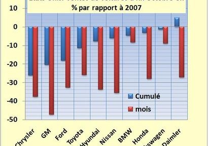 Les ventes globales de voitures au mois d’Octobre aux Etats-Unis apparaissent en baisse d’un tiers par rapport au même mois 2007. Elles atteignent même -41% pour les 4X4. En cumulé à fin Octobre, avec 11,5 millions d’exemplaires, ce sont 2 millions de voitures en moins qui ont été vendus par rapport à 2007, soit plus de 20 milliards de dollars de ventes perdues. Tous les constructeurs sont touchés par le mal (FIG.) du très atteint GM (-47%), il avait fait des promotions les mois précédents et gonflé ses ventes, aux inattendus Nissan (-35%), Honda (-28%) et Daimler (-27%) qui ne s’en étaient pas trop mal tirés jusque là. En cumulé sur l’année seul Daimler reste positif par rapport à 2007.Usvoituresventes200810