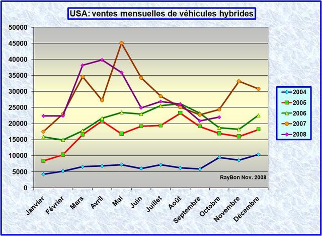Les ventes de voitures hybrides aux Etats-Unis ont atteint 22 mille exemplaires au mois d’Octobre. C’est mieux qu’en Septembre où les ventes avaient chuté à 20800 exemplaires, mais c’est 10% en-dessous des ventes du mois d’Octobre 2007. Ce chiffre est à comparer aux baisses de ventes générales de voitures de 27% durant ce mois. Les ventes de Toyota et de Ford sont en progrès sur ces modèles par rapport à celles du mois de Septembre. Il ressort donc que les ventes de voitures hybrides sont moins impactées par la crise que celles des modèles généraux. Elles représentent 2,6% des véhicules vendus aux Etats-Unis.