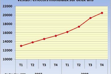 Le premier fabricant d’éoliennes du monde, le danois Vestas, a publié ses résultats trimestriels qui sont globalement bons. Le chiffre d’affaire du troisième trimestre à 1,759 mrds d’euros est en croissance de 53% par rapport à celui du même trimestre 2007. En cumulé depuis le début de l’année l’activité croît de 19% à 3,55 milliards d’euros. Les résultats intermédiaires dans l’année ne veulent pas dire grand chose puisque l’essentiel du résultat et du cash est réalisé au quatrième trimestre. Compte tenu des travaux en chantier, le chiffre d’affaire du quatrième trimestre devrait être correct. Cependant il est possible de noter quelques nuages à l’horizon 2009, avec un carnet de commande en baisse à la fin du T3 à 5848 MW par rapport à un carnet de 6529 MW à la fin du T2. Vestas a plus livré d’éoliennes au cours du trimestre qu’il n’en a rentré en commande. Il a « mangé du carnet ». La croissance des effectifs mondiaux de Vestas (FIG.) devrait se poursuivre jusqu’à la fin de l’année, mais elle pourrait s’arrêter en 2009 en attendant la fin du « credit crunch » affirme le communiqué.