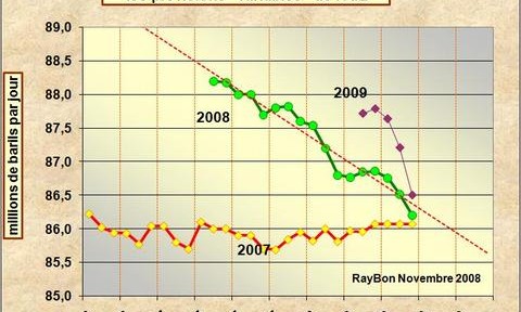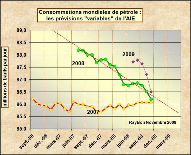 Il est un exercice intellectuel gagnant à tous les coups: c’est de prévoir pour le mois suivant, les prévisions de consommations de pétrole mondiales de l’Agence Internationale de l’Energie pour 2008. Cette vénérable institution, alors que nous sommes au mois de Novembre, a encore du mal à appréhender quelles seront les consommations mondiales de pétrole de l’année. Quelle entreprise garderait une telle contrôleuse de gestion? Elle vient tout de même de revoir dans son édition mensuelle de Novembre sa prévision pour 2008 en baisse, par rapport à celle du mois précédent, de 310 mille barils par jour et celle de 2009 de 710 mille barils par jour, une paille! (FIG.). Pronostiquons pour le mois prochain qu’elle poursuivra sa politique de réduction pour faire passer les consommations 2008 en dessous de celles de 2007.