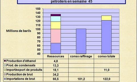 Après les perturbations importantes des productions de gaz cet de pétrole dans le Golfe du Mexique cet été, les opérateurs pétroliers US s’étaient largement approvisionnés sur le marché international, faisant ainsi grimper des stocks de pétrole et de produits dérivés en face d’une demande essoufflée. Il semblerait que cet épisode se soit terminé la semaine dernière. La demande en produits pétroliers est toujours faible à 19 millions de barils par jour. Elle est satisfaite par des importations de pétrole brut de 9,5 millions de barils/jour et de produits raffinés ou intermédiaires de 2,5 millions de barils/jour auxquelles s’ajoutent les productions locales voisines de 7 millions de barils par jour de pétrole et de condensats ainsi que les productions d’éthanol qui atteignent 0,7 millions de barils/jour (FIG.).