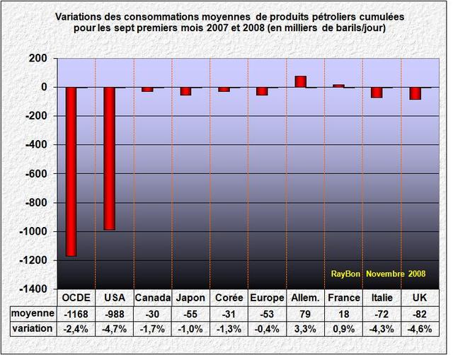 En cumulé depuis le début de l’année, la consommation des pays de l’OCDE apparaît en baisse de 1,17 millions de barils/jour (FIG.) dont près d’un million attribuables aux Etats-Unis. Seules l’Allemagne et la France apparaissent en augmentation dans ce bilan sur sept mois. Une extrapolation à fin d’année sur la base des résultats du mois de Juillet, conduirait le résultat de fin d’année pour les pays de l’OCDE, à une baisse des consommations de 1,35 millions de barils par jour, ce qui devrait compenser les accroissements de consommation de pétrole des pays NON OCDE.