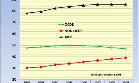 Nous sommes tout à fait dans ce scénario de compensation envisagé, les économies d’énergies des pays riches permettent aux pays émergeants d’accroître leur niveau de vie. Les Américains vont devoir admettre qu’ils se porteront beaucoup mieux et le monde avec eux, lorsqu’ils auront réduit leur consommation de pétrole par deux. Les prévisionnistes de tous poils vont devoir ramener à l’horizontale leurs courbes d’évolution dans le temps de consommation mondiale de pétrole.