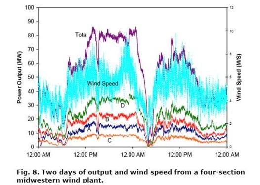 L‘introduction croissante dans les réseaux électriques de sources d’énergie d’origine éolienne apporte de plus en plus de perturbations, jugées inacceptables pour un réseau moderne d’électricité (FIG. profil de puissance produit par une ferme américaine de 138 éoliennes).