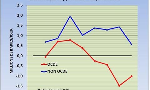 Les valeurs sont issues de celles publiées par l’Energy Information Administration et comportent les prévisions 2008 qui annoncent une décroissance de 50 mille barils/jour en 2008 par rapport à 2007 en raison de la très forte chute des consommations OCDE (FIG. courbe rouge). Pour 2009 l’EIA prévoit une décroissance de 450 mille barils/jour par rapport à 2008 en raison de la poursuite des décroissances de l’OCDE (-1 million bl/j) et d’une moindre croissance des pays NON OCDE (+0,55 million bl/j).