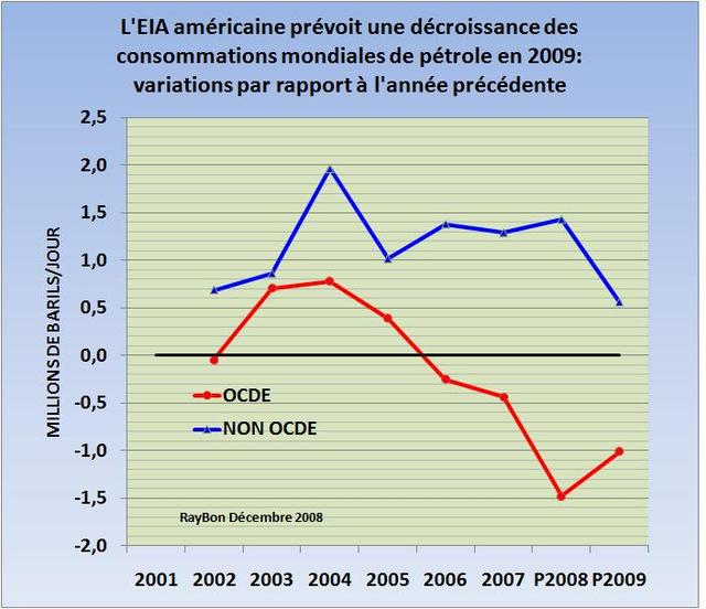 Les valeurs sont issues de celles publiées par l’Energy Information Administration et comportent les prévisions 2008 qui annoncent une décroissance de 50 mille barils/jour en 2008 par rapport à 2007 en raison de la très forte chute des consommations OCDE (FIG. courbe rouge). Pour 2009 l’EIA prévoit une décroissance de 450 mille barils/jour par rapport à 2008 en raison de la poursuite des décroissances de l’OCDE (-1 million bl/j) et d’une moindre croissance des pays NON OCDE (+0,55 million bl/j).
