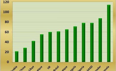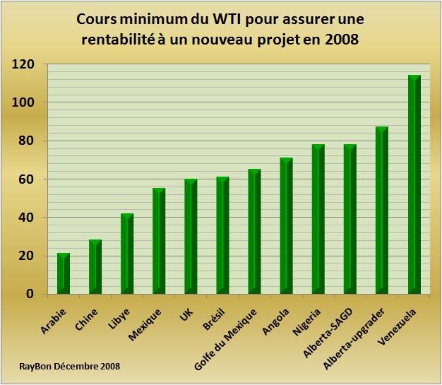 – l’arrêt des investissements ou parfois même des exploitations dans les zones les plus chères et par les pétrolières indépendantes ou les Etats les plus fragiles. La pénurie en capitaux et la baisse des prix du pétrole ont déjà provoqué l’arrêt de nombreux projets. Un classement réalisé par le CERA des cours minimum permettant de financer un nouveau projet dans diverses zones est intéressant à analyser (FIG.). Il tient compte des conditions actuelles de coût de sous-traitances et des taxes ou impôts prélevés par chacun des pays possédant les gisements. Les huiles lourdes du Bassin de l’Orénoque plombées par les taxes de Chavez et la complexité des procédés sont disqualifiées pour longtemps. Il n’est même pas sûr que l’exploitation dégage des marges brutes en ce moment. Les sables bitumineux de l’Alberta attendront une baisse des impôts, une baisse des prix de sous-traitance et des cours vers les 80 dollars. La aussi l’équation de l’Administration de l’Alberta est d’éviter l’arrêt des productions en cours. Les gisements offshore de la Mer du Nord, du Brésil, du Golfe du Mexique, de l’Angola qui concernent de nombreux nouveaux projets ne sont jouables qu’avec un brut à 60 où 70 dollars le baril. Avec les cours actuels seuls les nouveaux projets chinois, saoudiens ou libyens sont abordables. Or on sait que les Saoudiens ont arrêté tous leurs nouveaux projets dans le cadre des restrictions de quotas de production de l’OPEP. Le CERA estime que jusqu’à 40% des projets pourraient être menacés de report ou d’annulation pour des raisons de cash.