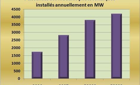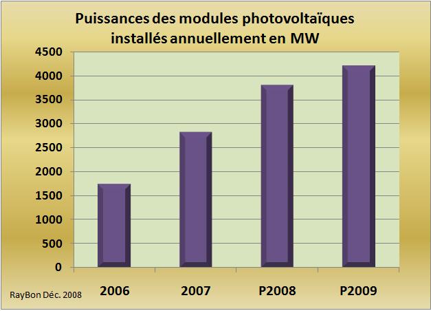 Le Bureau d’Etudes iSuppli prévoit pour 2009, sur fond d’excès de capacités de production, une baisse des facturations mondiales des industries du photovoltaïque malgré un accroissement des volumes installés. D’après cette étude, les facturations aux clients finaux devraient décliner à 12,9 milliards de dollars contre 15,9 estimées en 2008 soit une chute de 3 milliards de dollars représentant un recul de 19% de l’activité. Ce résultat devrait être obtenu dans un marché des modules solaires physiquement en croissance de 10%, puisqu’il devrait passer de 3,8 GW en 2008 à 4,2 GW en 2009 (FIG.).