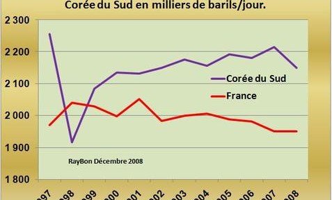 En 2007, la Corée du Sud a consommé 2,2 millions de barils par jour de pétrole, soit 10% de plus que la France (FIG.), ce qui ne la satisfait pas. Elle va élaborer un plan de développement de nouveaux véhicules verts qui lui permettra de devenir l’un des grands pays au monde pour la construction de voitures peu polluantes électriques ou hybrides rechargeables, sûrement derrière le Japon et la Chine. Le développement local des transports en commun sera également privilégié.