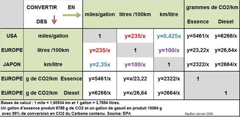 A l’approche du Salon de l’Auto de Detroit, il m’a semblé utile d’essayer de me doter d’un outil de conversion entre les consommations, les autonomies et les émissions de CO2 d’un véhicule, qu’il soit américain, japonais ou européen. L’exercice est assez indigeste. Les Américains et les Japonais caractérisent un véhicule à moteur par son autonomie mais les premiers sont en miles par gallon tandis que les seconds sont en kilomètres par litre. Nous caractérisons un véhicule par sa consommation, mais pour 100km pour obtenir un chiffre lisible en litres. Enfin les nouvelles directives européennes introduisent les émissions de CO2 exprimées en grammes par kilomètre parcouru. Elles obligent à séparer les véhicules en diverses catégories, en fonction des carburants utilisés qui ont des teneurs en carbone par unité de volume différentes. Bien sûr les normes pour définir ces valeurs expérimentalement sur des bancs d’essais sont toutes différentes d’un pays à l’autre, il serait donc superflu de faire des calculs d’une très grande précision.