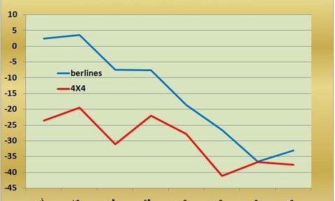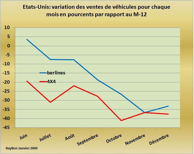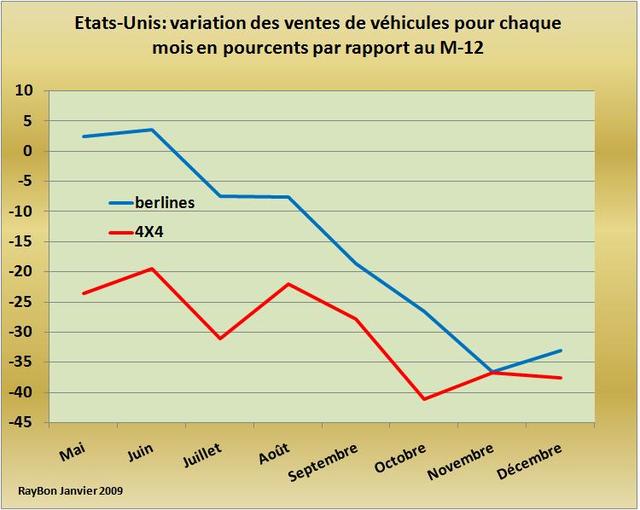 Les ventes de véhicules aux Etats-Unis en 2008 ont reculé de près de 2,9 millions d’unités, à 13,195 millions et venant de 16,089 millions en 2007. Ce recul de 18% des ventes s’est réparti de façon inégale entre véhicules importés (-11%) et productions domestiques (-20%). Ces chiffres bruts ne présentent qu’un maigre intérêt et il faut aller plus à fond dans l’analyse des ventes pour comprendre le scénario de la crise de l’industrie automobile américaine en 2008. Durant la première partie de l’année, avec l’augmentation des prix des carburants qui ont culminé au mois de Juillet à plus de 4$/gallon pour l’essence ordinaire on a vu les ventes de 4X4 s’effondrer alors que celles des berlines restaient à peu près stables (FIG.I).