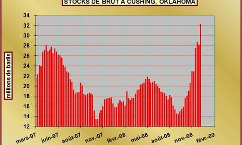 Celui qui peut stocker du pétrole aux Etats-Unis joue gagnant en l’achetant aujourd’hui et en le revendant à terme avec un mark-up de 5 dollars le baril sur l’échéance Mars ou de 10 dollars sur l’échéance Mai par exemple. C’est comme un grand cru, plus on le garde, plus il vaut cher. A part que dans ce cas ce sont des mois de garde et non des années. On nomme cette situation: contango. Relance Obama, quotas OPEP en retrait, raffinage restreint, l’ensemble du marché est persuadé de la hausse future. Alors les stocks physiques de pétrole en Amérique n’arrêtent pas de croître. Le stock le plus représentatif est celui de Cushing, bourgade de l’Oklahoma où s’échangent physiquement les volumes de WTI cotés sur le NYMEX à New York. Les stocks à Cushing sont à leur plus haut historique à plus de 32 millions de barils (FIG.) gagnant plus de 4 millions de barils en une semaine.