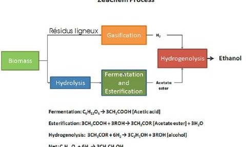 ZeaChem, start-up américaine, a réussi à lever 34 millions de dollars auprès d’un pool d’investisseurs fortunés parmi lesquels se trouve Valero, le plus gros raffineur américain. Ce montant va permettre à ZeaChem de réaliser un pilote de production d’éthanol selon un procédé original. Le procédé ZeaChem part de matière ligno-cellulosique qu’il sépare par hydrolyse de la cellulose et de l’hémicellulose, en sucres, xylose (C5) et glucose (C6) d’une part et en résidus ligneux solide d’autre part. C’est donc un procédé bio qui au départ, comme tous les autres procédés de ce genre, n’utilise que la moitié environ de la ressource de biomasse. Il procède ensuite à une transformation de ces sucres en acide acétique par le Clostrodium thermoaceticum des thermites, procédé qui ne génère pas de CO2, contrairement à la fermentation alcoolique. Puis l’acide est estérifié et enfin, l’acétate est transformé en alcool par hydrogénation catalytique (hydrogénolyse). Le bilan conduit à 3 moles d’éthanol par mole de cellulose au lieu de deux par fermentation alcoolique (FIG.).Zeachem