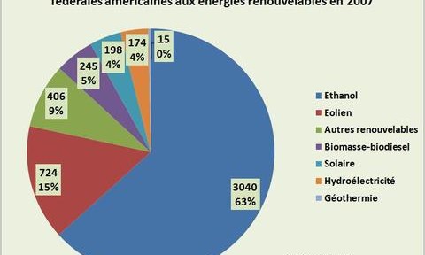 L‘Environmental Working Group américain, association écolo de toute évidence très remontée contre le bioéthanol américain produit à partir de maïs, s’insurge contre l’ampleur des subventions accordées à cette filière par l’Etat fédéral. A cette occasion elle publie un extrait du volumineux rapport du DOE concernant ses interventions et ses aides aux industries de l’énergie en 2007 (LIRE). D’après ce travail, les subventions accordées à la filière éthanol, de 3 milliards de dollars, représenterait 63% des subventions fédérales accordées aux énergies renouvelables (FIG.). Ces chiffres mettent en évidence l’hypertrophie de la solution fuel éthanol choisie naïvement  par l’administration Bush comme solution à tous les problèmes énergétiques américains. D’après le DOE ces subventions à l’éthanol devraient atteindre 3,6 milliards de dollars en 2008 et 4,5 milliards en 2009, puisqu’elles sont attachées aux volumes produits au travers essentiellement de la Volumetric Ethanol Excise Tax qui était de 51 cents par gallon jusqu’à fin 2008 et qui depuis le premier Janvier 2009 est de 45 cents par gallonUsa2007subventionsfederales