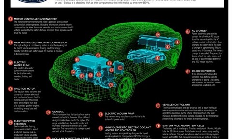 Au salon de Detroit les constructeurs montrent ce qu’ils ont développé et, s’ils n’ont pas grand chose à dévoiler, parlent beaucoup de ce qu’ils développeront plus tard. Dans ce cadre Ford a présenté son alliance avec Magna International pour développer en commun un véhicule électrique pour 2011. Vaste programme. Le nombre de composants à développer, à faire fonctionner ensemble harmonieusement et durablement est impressionnant (FIG.). Cela va de l’ensemble batterie-contrôleur-chargeur, à l’unité de contrôle de tout le véhicule et à tout le module de traction et fonctions annexes.