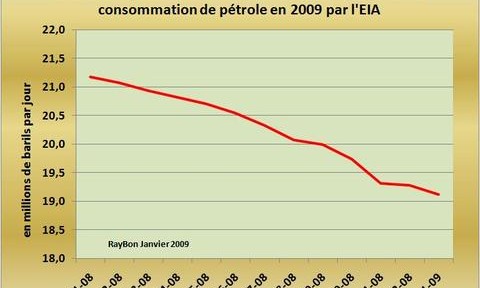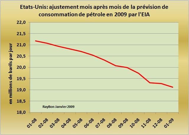 L‘Energy Information Administration, suivant les prévisions des économistes, revoit chaque mois les consommations d’énergie des Etats-Unis pour 2009 à la baisse. Ces consommations baisseraient globalement d’un pourcent, tirées à la baisse par les consommations de pétrole qui chuteraient de 2% à 19,1 millions de barils/jour venant de 19,5 en 2008. Les consommations de gaz baisseraient d’un pourcent en raison d’une demande stable d’électricité et de la baisse de la demande industrielle. Les consommations de charbon seraient également en baisse de quelques fractions de points. Mais l’EIA attire fort justement l’attention du lecteur sur la fragilité de ses prévisions de consommations en produits pétroliers (FIG.) qui vont dépendre dans une large mesure du comportement des consommateurs américains. En particulier l’EIA doute de la pérennité de l’engouement des citoyens américains pour les transports en commun, observé durant l’été 2008, avec les nouveaux prix cassés des carburants. La possibilité d’une reprise des consommations avec la baisse des prix à la pompe ne peut pas être négligée.