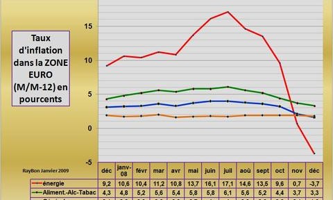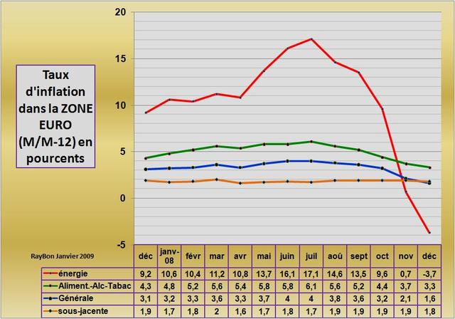 L‘inflation sous-jacente de la Zone Euro (hors énergie et alimentation) a été remarquablement stable en 2008, variant entre 1,7% et 2% (FIG. courbe orange). Ces chiffres confirment le caractère obsessionnel des craintes de notre banquier central d’une inflation de second tour (inflation par les salaires) durant une trop large partie de l’année. Ils nous informent également qu’il n’y a pas de phénomène déflationniste généralisé en Zone Euro. L’arrêt de la spéculation massive sur tous les marchés de « commodities » au mois de Juillet qui a entraîné la chute des cours de l’énergie et des matières premières industrielles et agricoles à partir du mois d’Août, a alors massivement impacté à la baisse l’inflation générale. Le poste énergie est même devenu négatif au mois de décembre, le poste alimentation-alcools-tabac et passé de 6,1% en Juillet à 3.3% en Décembre (courbe verte). Tous ces mouvements à la baisse amènent l’inflation générale à 1,6% (courbe bleue), en dessous de l’inflation sous-jacente qui est à 1,8%.