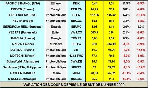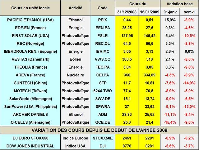Rien ne marche très fort autour des énergies renouvelables dans le monde. Le numéro un chinois du photovoltaïque, Suntech vient d’annoncer qu’il avait licencié 800 personnes au quatrième trimestre, soit 10% de ses effectifs. Il a stoppé toute expansion en attendant des jours meilleurs. Les volumes commercialisés en 2009 dans le monde ne pourraient croître que de 20% à 7GW, contre une tendance longue de croissance de 40%, mais avec des prix en décroissance de 30%. Du côté des biocarburants, VeraSun qui est sous la protection du Chapter 11 mettrait en vente aux enchères 7 de ses usines de production d’éthanol. Actuellement il en possède 14 en n’en fait marcher que 4. Ces nouvelles pèsent sur la tendance du secteur malgré les discours obamaniens enflammés qui suscitent certains doutes. Suntech perd 15% de sa valeur sur la semaine, Sun Power se replie de 13% et First Solar recule de 10%. La meilleure performance revient à Iberdrola Renovables dont le cours est stable sur la semaine (TAB.).