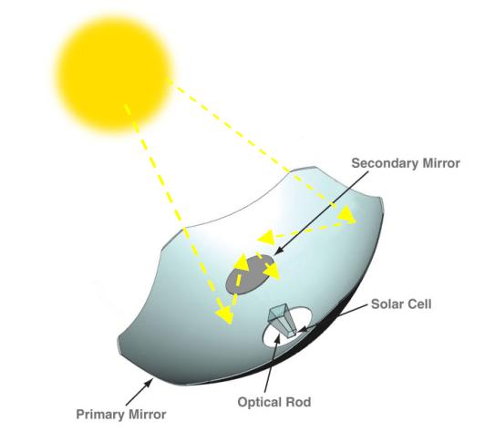 La capture du rayonnement et sa focalisation va se faire avec des rendements médiocres par unité de surface de module et le rendement de conversion pratique par module va fortement décroître. L’allemand Concentrix Solar revendique un rendement de 27,2% alors que la californienne SolFocus revendique un rendement de 25%. Le premier utilise des lentilles de Fresnel (FIG du bas) pour focaliser les rayons, la deuxième utilise deux miroirs (FIG.) qui utilisent de façon incomplète toute la surface du module.