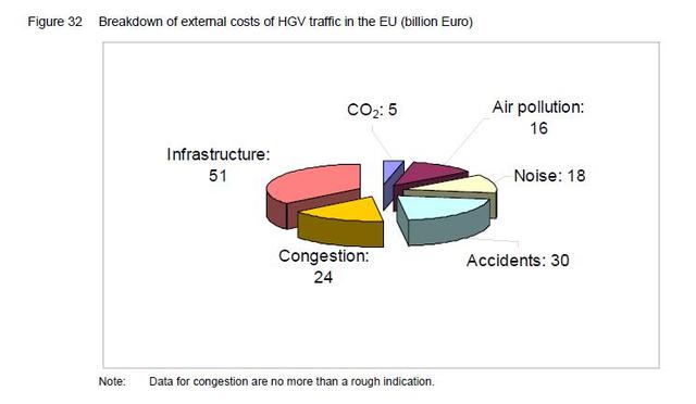 Dans une étude du consultant néerlandais CE Delft relative aux coûts externes du transport routier de marchandises, le coût annuel externe des nuisances générées par la circulation des poids lourds dans l’Europe des 27 est grossièrement estimé à 144 milliards d’euros. Parmi ces coûts l’étude recense les atteintes aux infrastructures, les accidents, les embouteillages, le bruit et les émissions de gaz (FIG.). L’étude rapproche ce coût estimé aux taxes payées par le transport routier de marchandises qui atteint annuellement 54 milliards d’euros.