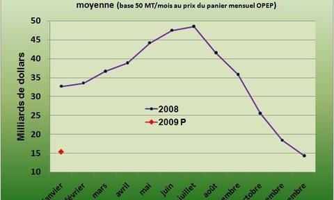 Pour estimer la dépense mensuelle de l’Europe des 27 dans le courant de 2008 et en ce début 2009 un calcul simple partant d’un volume moyen importé de 50 millions de tonnes par mois et payé au prix du panier OPEP moyen mensuel a été réalisé (FIG.). Les résultats nous indiquent que cette facture mensuelle aurait varié en 2008 entre 48 milliards de dollars au mois de Juillet et 14 milliards de dollars au mois de Décembre. La facture de ce mois de Janvier 2009 devrait être autour de 15 milliards de dollars soit 17 milliards de moins que celle du même mois 2008. Formidable outil de relance économique!
