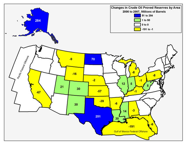 A la fin 2007 les réserves prouvées de liquides (pétrole + gaz liquéfiables) américaines atteignaient donc 30,4 milliards de barils qui sont à comparer aux 7 millions de barils extraits quotidiennement (5,2 millions de pétrole et 1,8 millions de gaz liquéfiés).