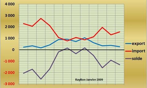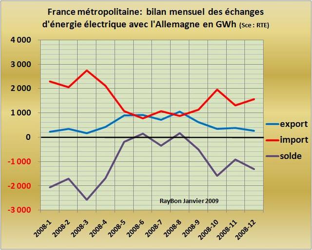 L’Allemagne dont 70% de l’énergie électrique est produite par des centrales à flamme (381/541TWh), a fourni en 2008, à la France 19 TWh d’énergie électrique, ce qui correspond à une puissance 24h/24 de 2160 MW. Le solde des échanges France-Allemagne d’électricité a été de 12,6 TWh en 2008, soit une puissance moyenne de 1430 MW (FIG.). La consommation d’électricité allemande par les français participe aux émissions de CO2. Sur la base d’un million de tonnes de CO2 par TWh thermique ce sont donc près de 14 millions de tonnes de CO2 induites par les consommations françaises.
