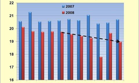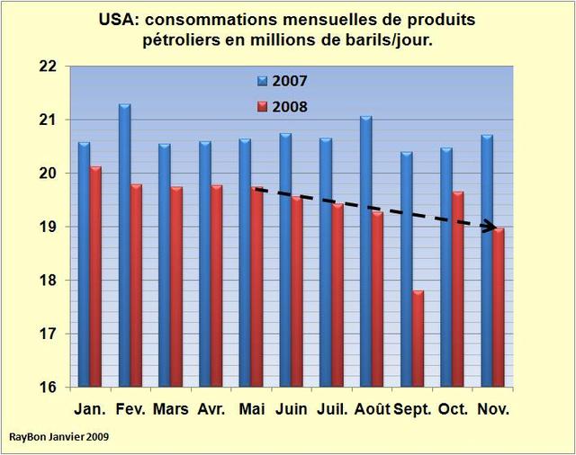 Les consommations moyennes mensuelles en produits pétroliers aux Etats-Unis sont ressorties à près de 19 millions de barils/jour au mois de Novembre. Pour positionner ce résultat par rapport à ceux des mois précédents il faut faire abstraction des consommations du mois de Septembre, perturbées par les ouragans dans le Golfe du Mexique et de celles du mois d’Octobre qui ont été dopées par les reconstitutions de stocks et d’en cours épuisés le mois précédent. La baisse des consommations apparaît continue depuis six mois (FIG.) avec une pente mensuelle d’un peu plus de 100 mille barils/jour.